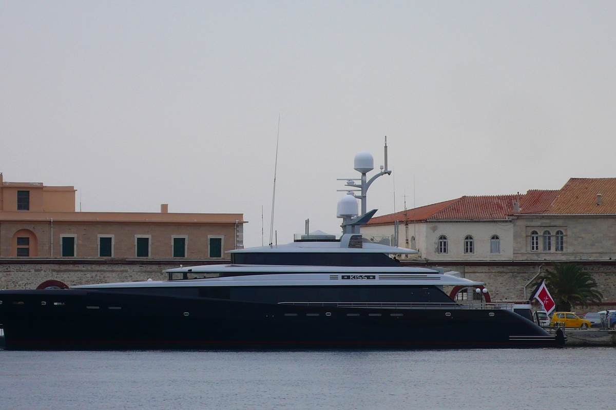 Dans le port d’Ermoupoli, de super bourges pétés de thunes dans leurs barques sinistres, avec pavillon maltais. L’un s’appelle Kiss, et l’autre Option B : une histoire à imaginer.